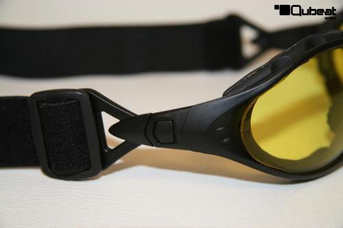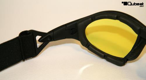 Der Innenrand der Brille ist gepolstert und sorgt für angenehmen Tragekomfort. Die Belüftung erfolgt durch Lüftungskanäle in der Polsterung. An der Seite des Bügels befindet sich ein bewegliches Gelenk.