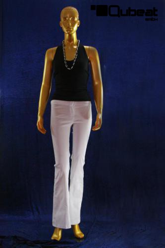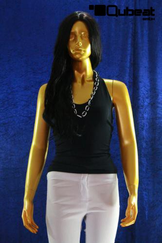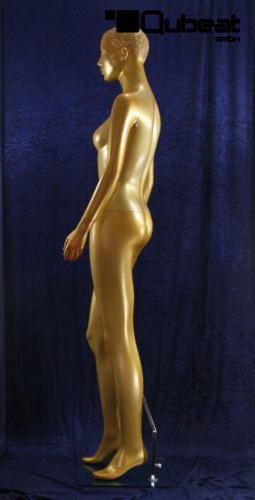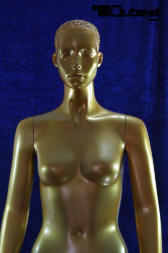 Hier haben Sie die Gelegenheit eine sehr exklusive weibliche Schaufensterpuppe in goldener Lackierung zu erwerben. Mannequins in Gold sind allgemein sehr schwer zu finden und deshalb ein Blickfang in jeder Modeboutique. Die Figur verfügt darüber hinaus über modelliertes Haar, was das Tragen einer Perücke nicht zwingend erforderlich macht.